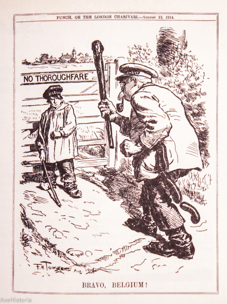 Caricatura îl arată pe Kaiser-ul German care amenință micuțul stat belgian, promițându-i provincii din Franța, ilustrate prin cârnații care-i atârnă din buzunar. Belgia nu a cedat tentațiilor promise și în momentul în care i-a fost încălcată neutralitatea, l-a surprins pe Kaiser prin ferocitatea rezistenței, întârziind avansarea armatei germane spre Franța cu câteva săptămâni.