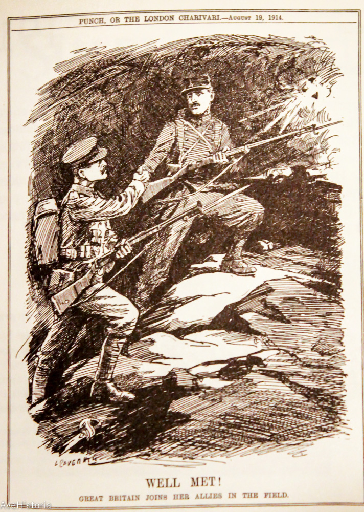 Un soldat britanic strânge mâna camaradului său francez, luptând împreună împotriva dușmanului comun, Germania.