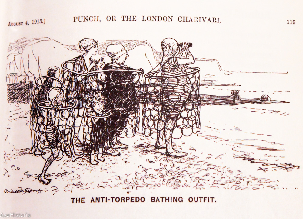 Războiul s-a extins și pe mare, dar blocada germană din jurul arhipelagului britanic nu a micșorat plăcerea celor care doreau să se scalde în mare..câteva măsuri de protecție se impuneau totuși pentru a evita să fie atinși de torpile…