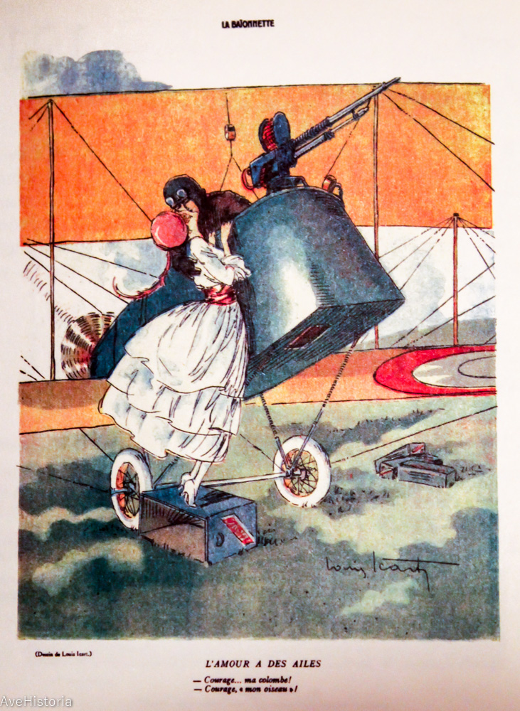Caricatura Dragostea are aripi ilustrează șarmul pe care-l aveau piloții de avioane asupra femeilor. De familie bună, eleganți, curajoși, cu maniere de gentlemani, piloții rupeau cu ușurință inimile feminine. Ei sunt numiți as atunci când doboară minim 5 avioane inamice. Pilotul german, Manfred von Richtofen alias baronul roșu, a fost considerat asul așilor. Despre el s-a făcut un film The red baron cu un scor de 6,4 pe IMDB.