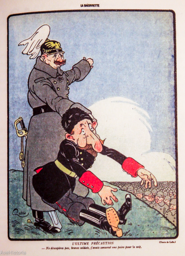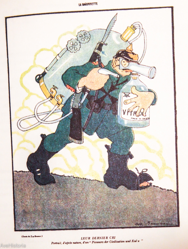 Germanii folosesc pentru prima dată o nouă armă cu efecte atroce…gazele chimice. Presa franceză îl prezintă ironic pe un soldat german barbar hotărât să impună o civilizașie așa-zisă superioară.