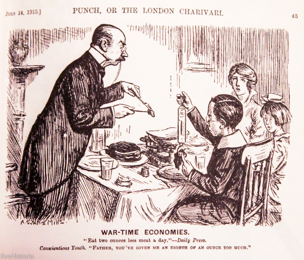 Pe măsură ce războiul se prelungea, aprovizionarea cu mâncare devine problematică, iar cei de acasă trebuiau să strângă centura. Iată propaganda britanică ce îndemna: Mâncați două uncii de carne mai puțin pe zi!…