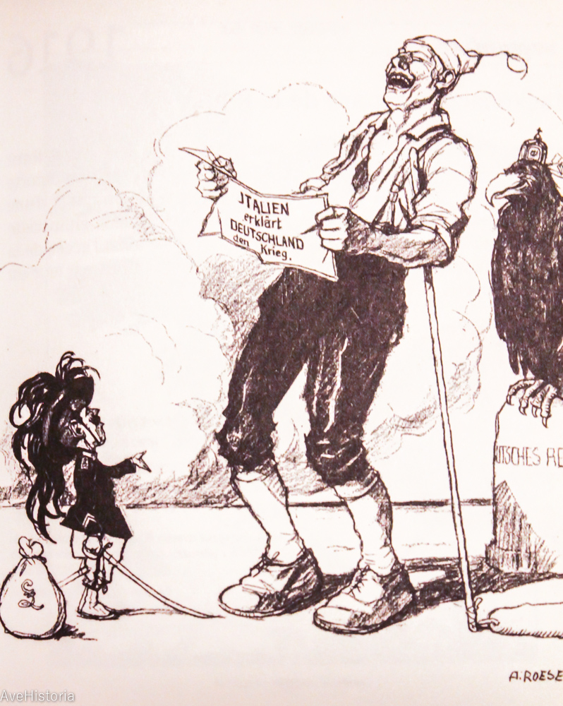 Italia declară război Germaniei. Caricatura germană îl ilustrează pe un țăran german care primește amuzat declarația de război a Italiei de la minusculul rege Victor-Emmanuel III.