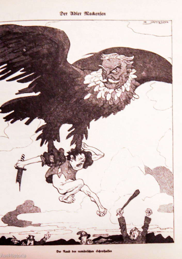 Caricatura, îl ilustrează pe Mackensen ca un vultur care prinde în ghearele sale firava armată română, sub nasul aliaților ei, Marea Britanie, Franța și Rusia.