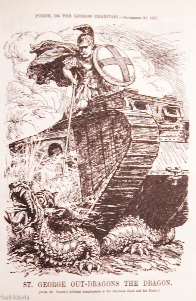 Folosite pentru prima dată în bătălia de pe râul Somme, tancurile, invenție britanică inedită, au luat cu asalt tranșeele germane precum Sfântul Gheorghe (patronul Angliei) care ucide dragonul.