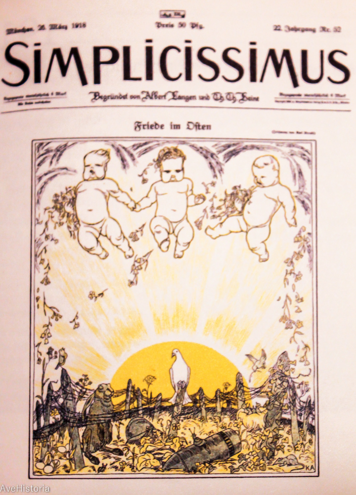 In caricatură, porumbelul și îngerii celebrează pacea, răsăritul soarelui și venirea primăverii aduc speranța victoriei pentru Germania.
