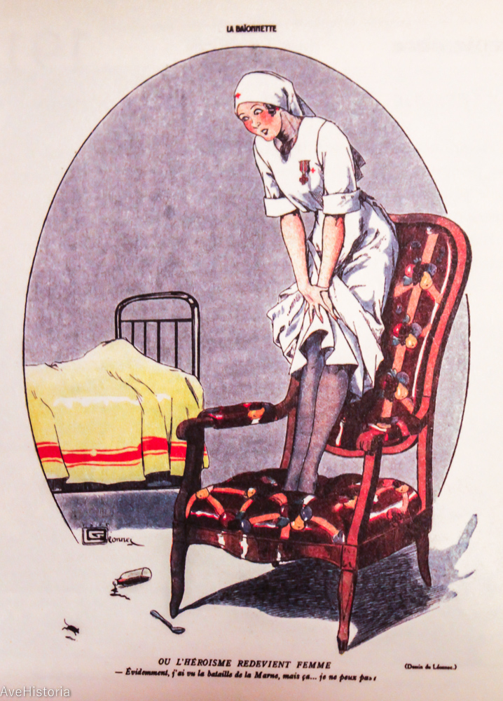 In timpul războiului mii de femei s-au înrolat ca infirmiere voluntare mânate de dorința de a ajuta răniții și a le salva viața. Adevărate eroine, multe scoțând soldații răniți sub ploaia de gloanțe, ele au luptat și cu prejudecățile vremii. Efortul lor a fost salutat de toată lumea, dar nu de puține ori, ironiile și-au făcut loc și în caricatură. In cea de mai jos, aflată în preajma unui cadavru, o infirmieră este înspăimântată la vederea unui șoricel și spune: Bine, am văzut bătălia de la Marna, dar asta…nu pot să suport!