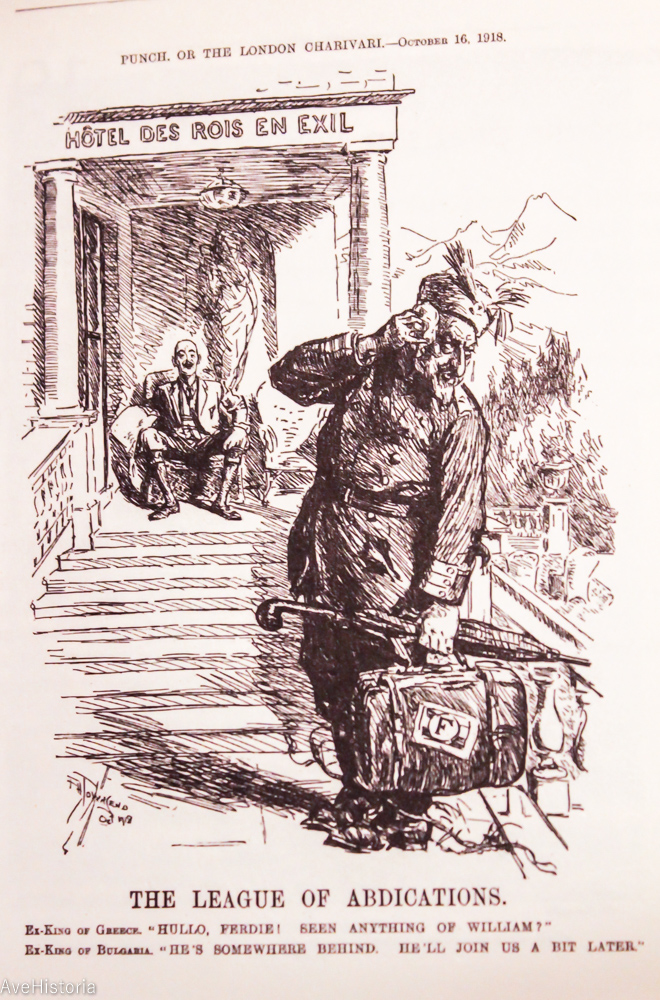 Infrânt, regele Ferdinand al Bulgariei abdică și pleacă în exil. Presa britanică l-a ilustrat ironic purtând un dialog cu regele Greciei, Constantin I și el plecat în exil, despre Kaiserul german.